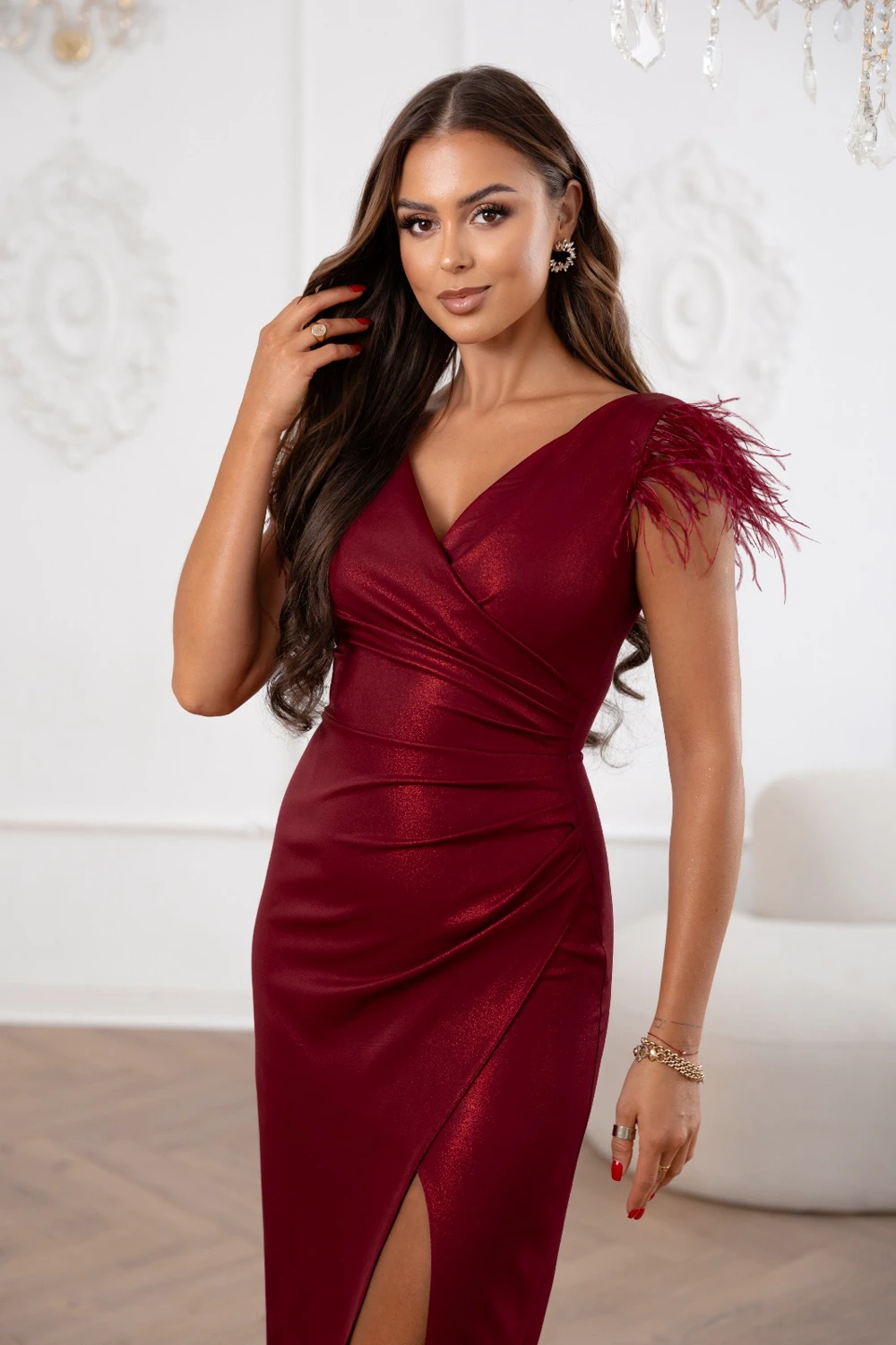 KATNISS SUKIENKA LAURA MAXI Z PIÓRAMI BORDOWA BŁYSK