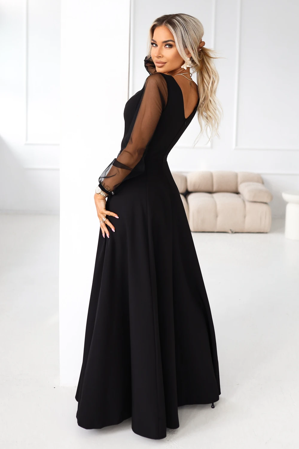 SUKIENKA ROZKLOSZOWANA MAXI Z TIULOWYM RĘKAWEM CZARNA