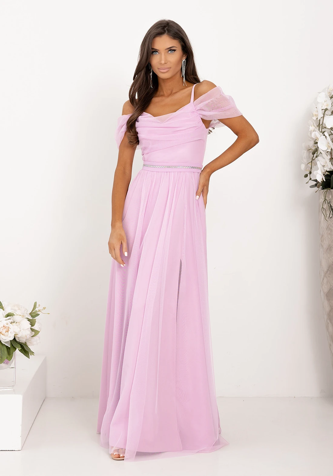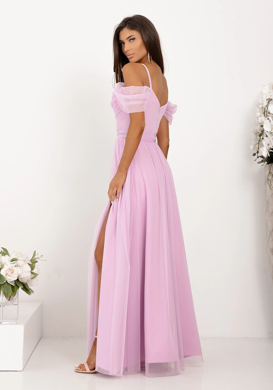Rozkloszowany dół z tiulu miękko układa się przy każdym ruchu, tworząc efekt zwiewności i lekkości. W zestawie znajduje się ozdobny pasek, który optycznie wysmukla sylwetkę i nadaje całości eleganckiego wykończenia. Suknia posiada rozporek, który subtelnie odsłania nogę.
